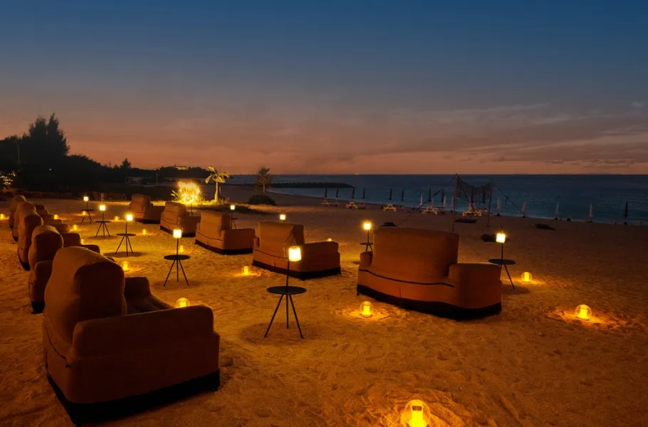 ホテルの敷地内や、隣接する残波ビーチは温かな光で照らされ、