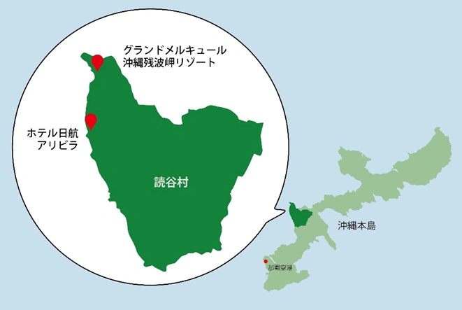 2024年にグランドオープンした「グランドメルキュール沖縄残波岬リゾート」と、開業30周年を迎えた「ホテル日航アリビラ/ヨミタンリゾート沖縄」は、読谷エリアに立地するホテルとしてタッグを組み、より一層充実したリゾート体験をしていただくため、双方向のサービス提供を行っております。