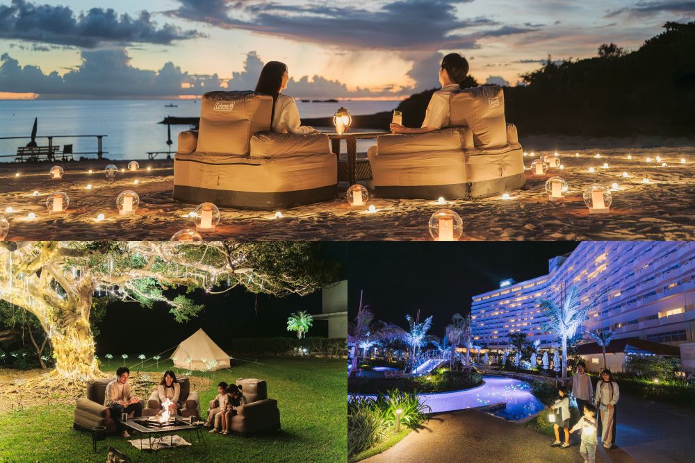 The hotel premises and adjacent Zanpa Beach are illuminated by warm light,