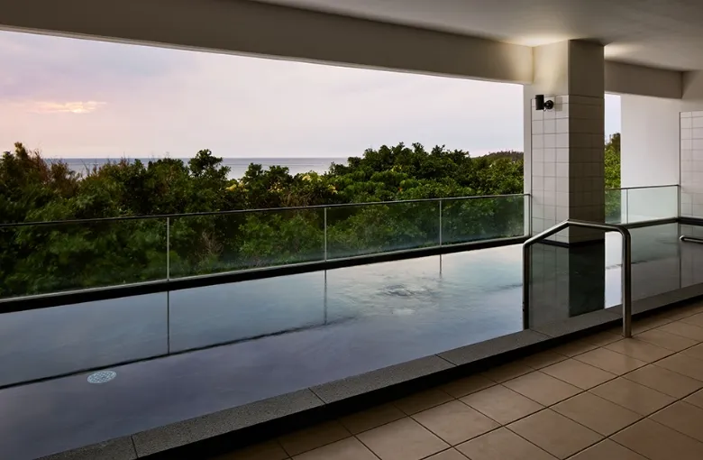 在眺望美麗大海的展望浴池中寬廣的大浴場。
